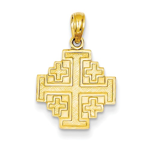 The Jerusalem Cross, also known as the Crusaders Cross and the Five-Fold Cross, is comprised of Greek and Tau crosses. Four Tau crosses meet in the center creating a Greek cross. Four additional Greek crosses, one in each corner, make a total of five crosses. The pendant measures 3/4" with the bail.The symbolism of the five crosses has been explained in a variety of ways. Here are a few:
