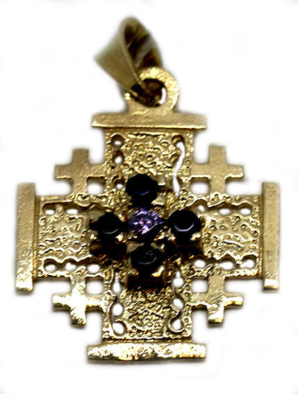 14K Gold Jerusalem cross pendant set with precious stones from the Holy Land