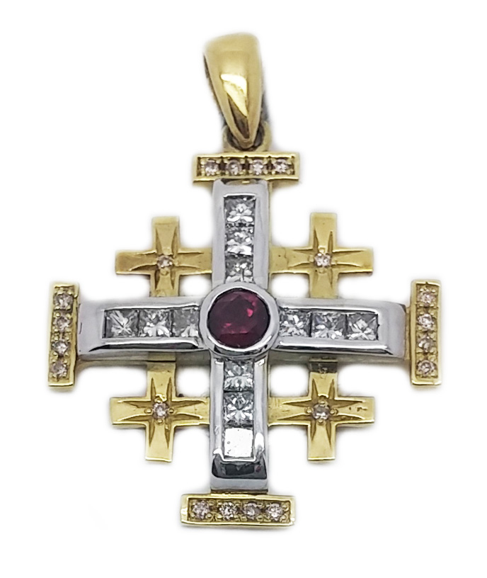 14K Gold Jerusalem Cross pendant set with Diamonds and Ruby hand crafted in Israel 1" 26 mm