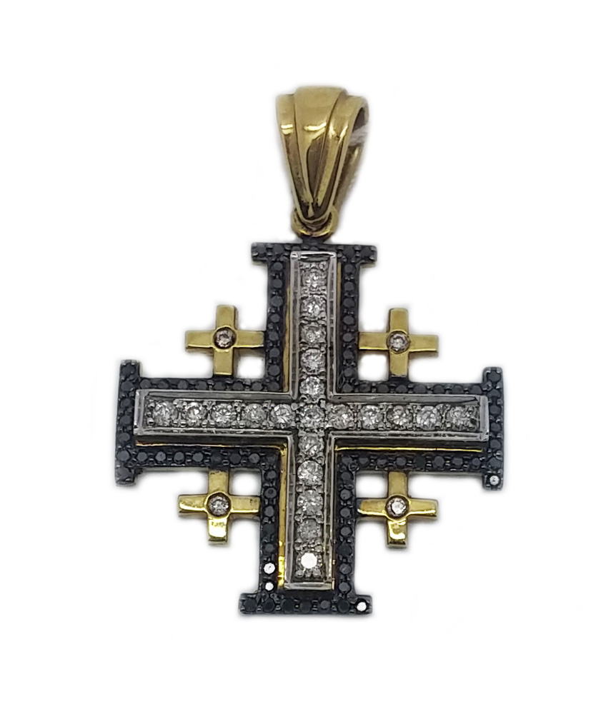 14K Gold Jerusalem cross pendant set with BLACK AND CLEAR Diamonds hand crafted in Israel. The pendant measures 1" or 26 mm without the bail and includes 0.25 diamonds.