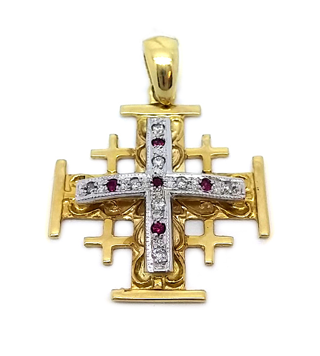 Hand crafted in the Holy Land solid 14k gold Jerusalem cross pendant with Rubies, the pendant measures 1 inch or 26 mm with the bail and comes gift boxed.