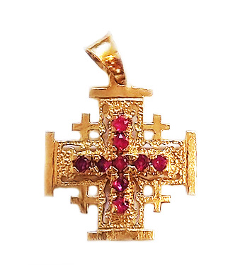 14K Gold Holy Land Jerusalem Cross set with Rubies - The pendant measures 1" or 26 mm.