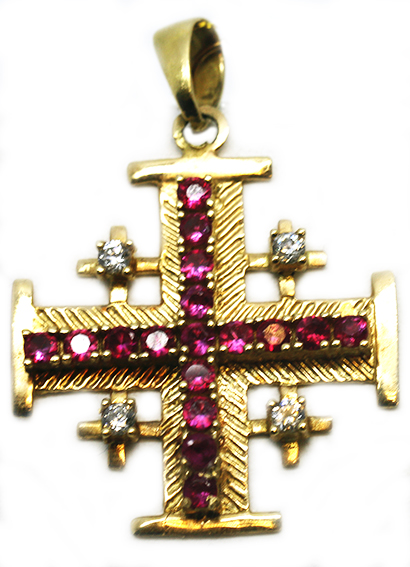 Jerusalem Cross pendant handcrafted from 14k gold set in precious stone Rubies and Diamonds in Jerusalem the Holy Land, the pendant measures 1.2 inch and comes gift boxed.