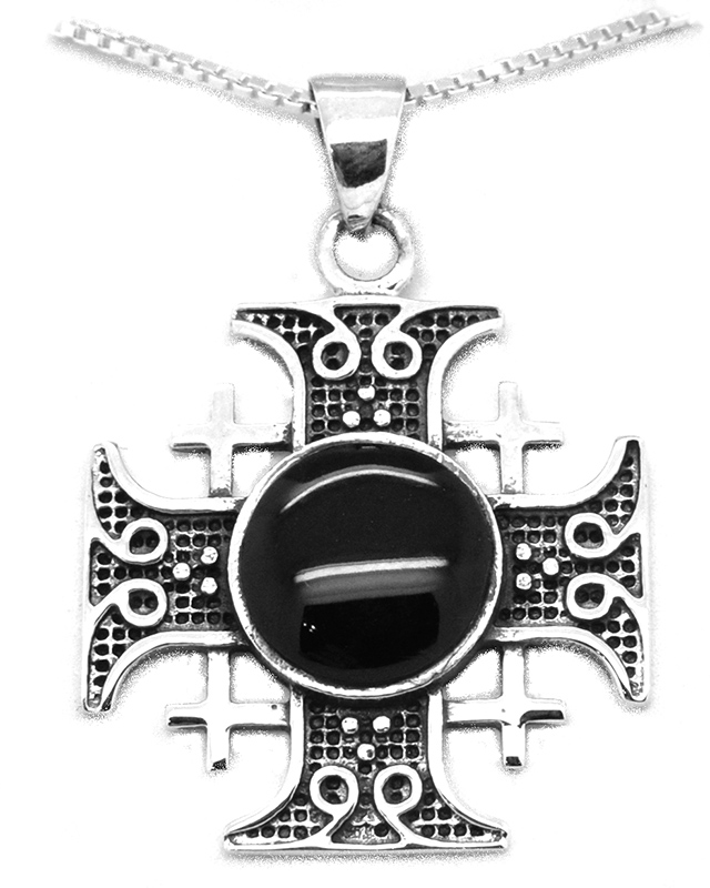 Handcrafted from 925 Sterling Silver Jerusalem Cross pendant with onyx , the pendant measures 1 1/4” with the bail and comes gift boxed.