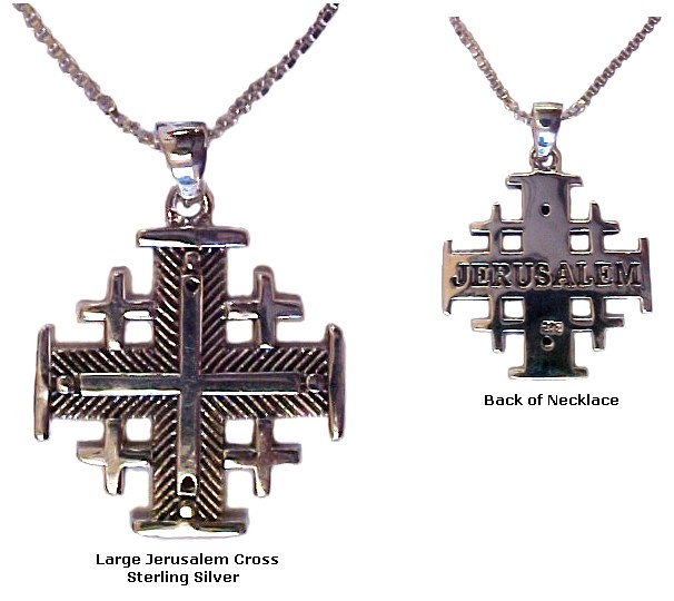 Jerusalem Cross also known as the "Crusaders Cross" or, the "New Jerusalem Cross", focusing attention on the Divine and heavenly restoration of Jerusalem. The large center Cross symbolizes the person of Christ. It is surrounded by 4 Crosses symbolizing the belief that Jerusalem is the spiritual center of the earth and Christ's commandment to spread the Gospel from Jerusalem to the four directions of the world, a mission that started in Jerusalem .