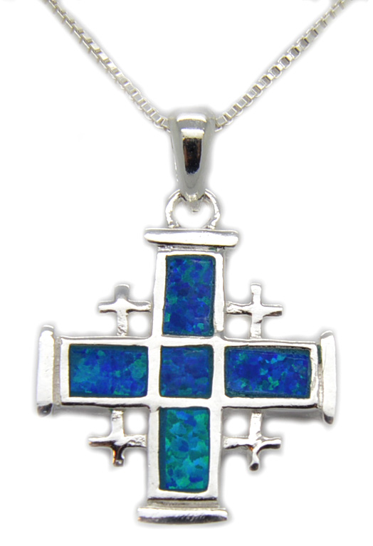 LARGE 925 STERLING SILVER JERUSALEM CROSS PENDANT WITH OPAL STAMPED JERUSALEM IN THE BACK, MEASURES 1 1/4" WITH THE BAIL AND COMES WITH 18" STERLING SILVER BOX CHAIN STAMPED JERUSALEM IN THE BACK - GIFT BOXED.