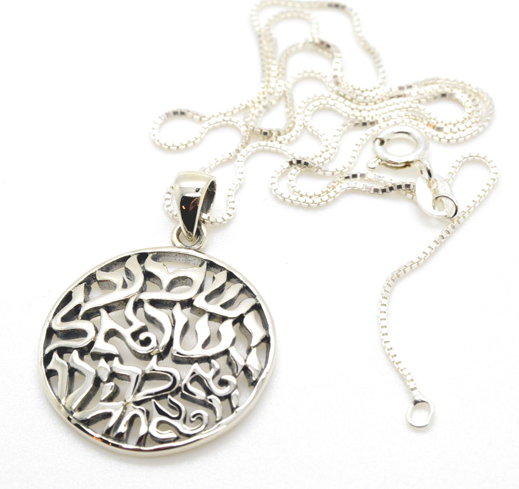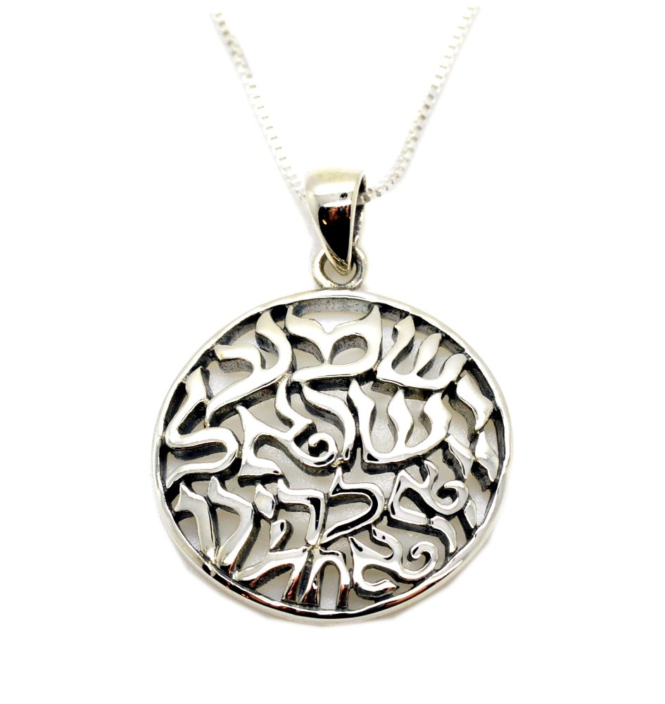 Shema Israel pendant and necklace all in 925 Sterling Silver. Shema Israel are the first two Hebrew words used in the morning and evening Jewish prayer services - their meaning is "Hear, O Israel: the Lord is our God, the Lord is One". The sterling silver pendant measures 1" and the necklace is a 18" in length.