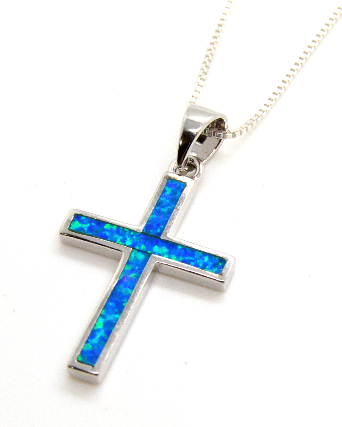 Beautiful 925 Sterling silver cross pendant with blue opal. Measures 1" 24 mm with the bail - gift boxed.