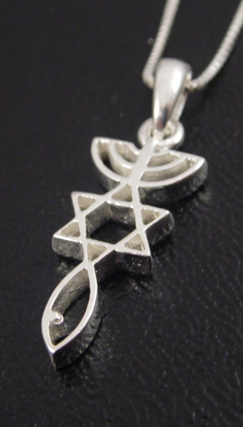 This Messianic symbol links Jew and Gentile, the Old and New Testaments, and Judaism and Christianity. It is a living faith in the God of Abraham, Isaac and Jacob; a faith that came to include all Christians when one of Israel's own sons, the Jew from Nazareth brought God's light to the nations. Messianics celebrate Jesus (Yeshua) as the risen Messiah of Israel as foretold throughout biblical scripture.Sterling silver pendant with the Menora,star of david and the fish handcrafted in Jerusalem size 25mm or 1" without the bail, comes with 18" sterling silver box chain gift boxed.